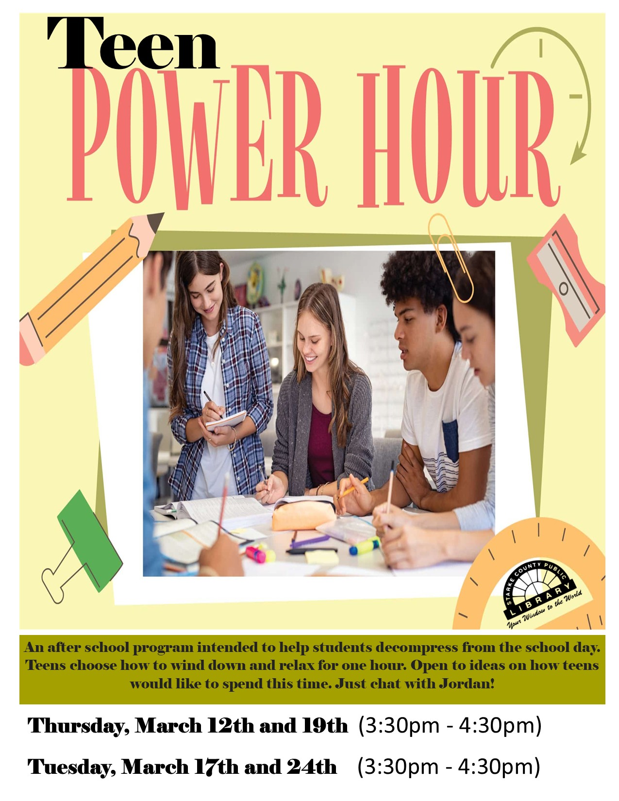An after school program intended to help students decompress from the school day. teens choose how to wind down and relax for one jour. Open to ides on how teens would like to spend this time. Just chat with Jordan.